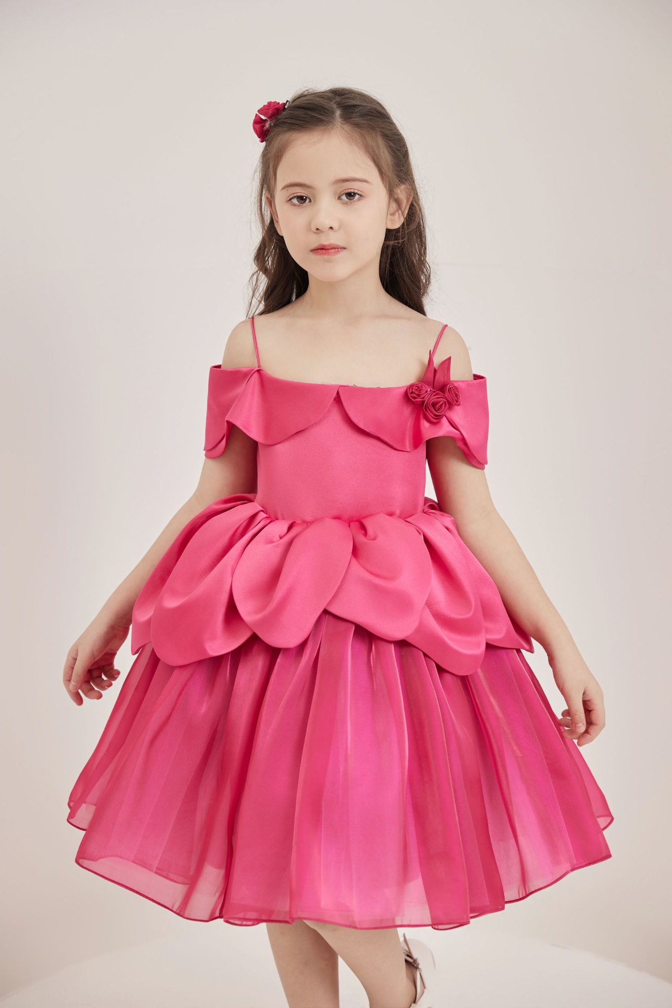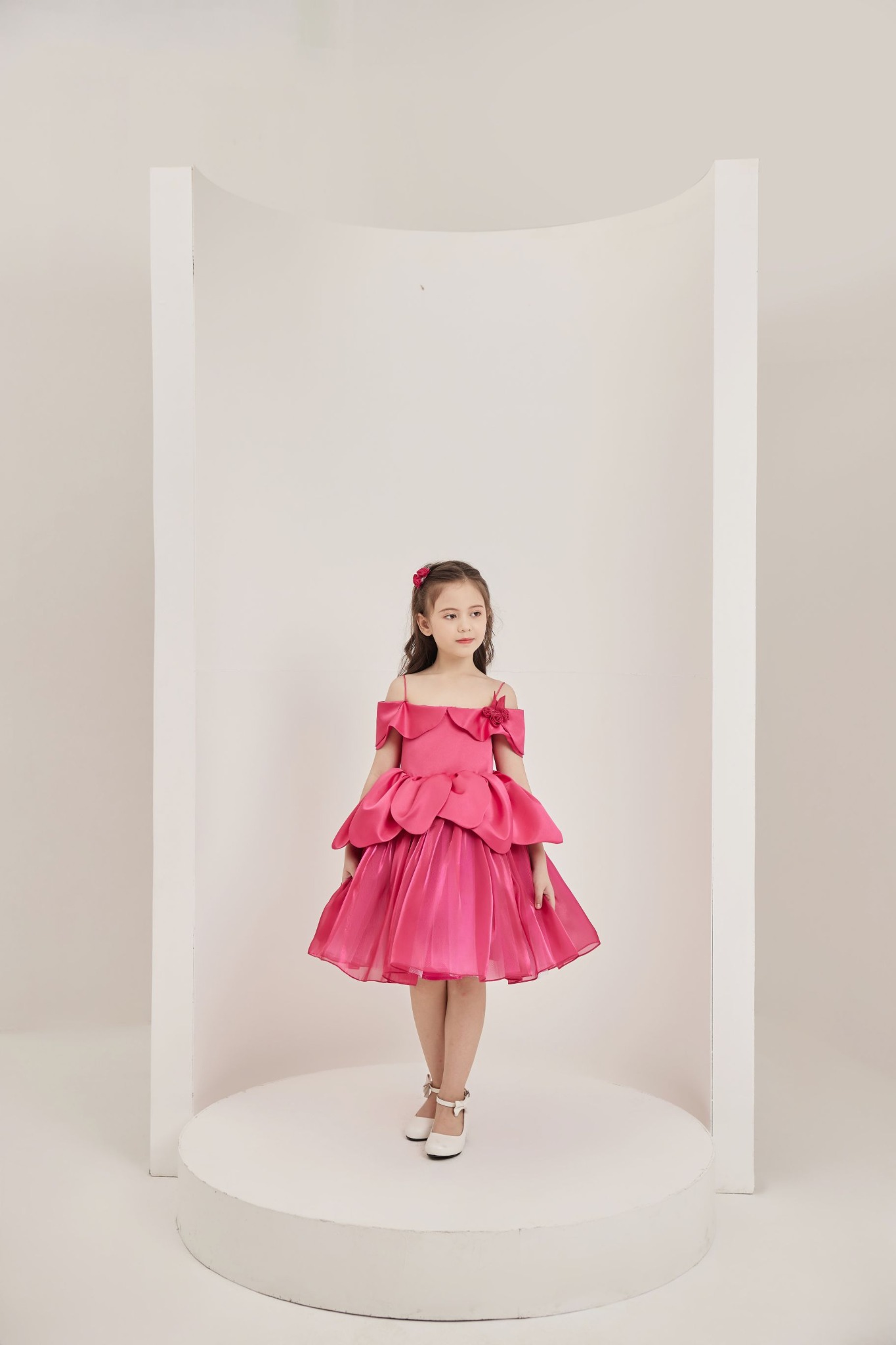 Một khóm hồng nhỏ xinh cài trên ngực áo; một dáng váy trễ vai với phần vạt được cắt lượn tinh tế; một chiếc váy dạ hội 2 tầng với tùng váy xếp nếp bồng bềnh, mềm mại và tầng trên được cách điệu như một đóa hồng đang bung nở nhờ những cánh hoa được cắt vải tạo hình khéo léo; tất cả đều hòa quyện lại với nhau trong thiết kế dịu dàng, nữ tính nhưng không kém phần nổi bật của Danbi.