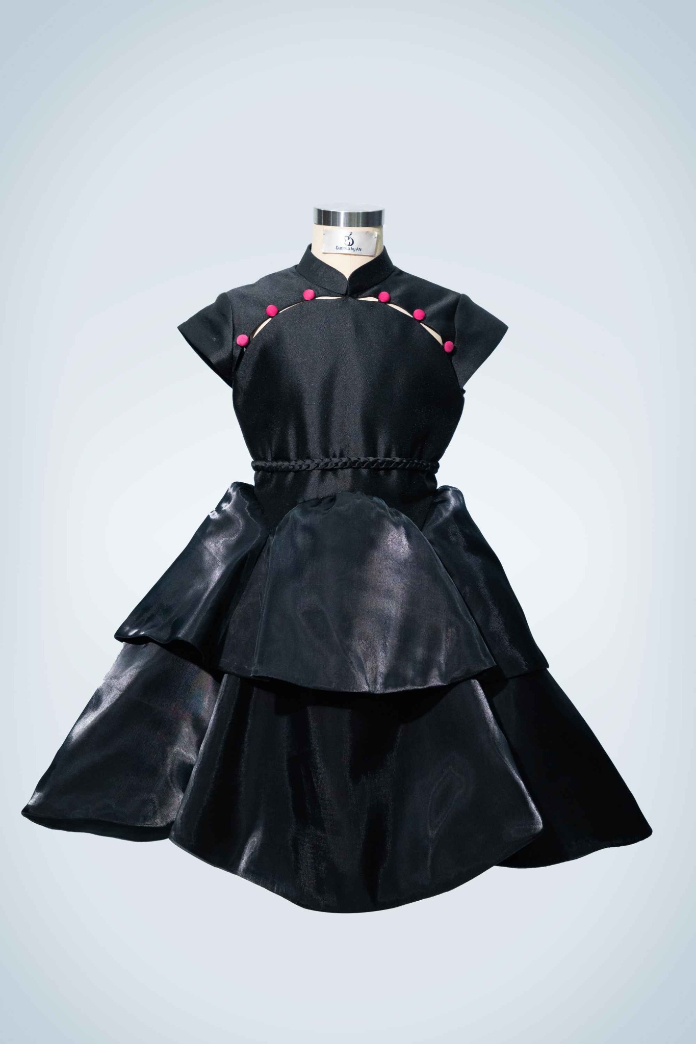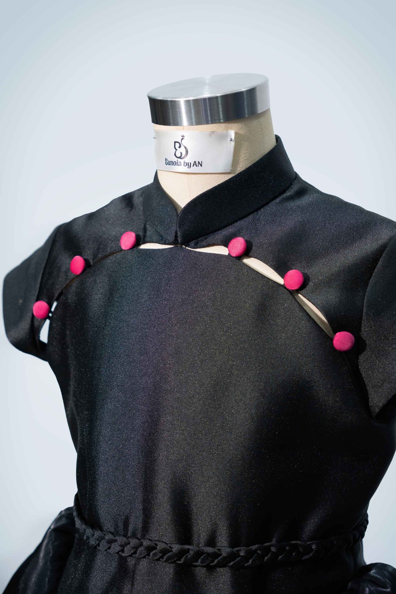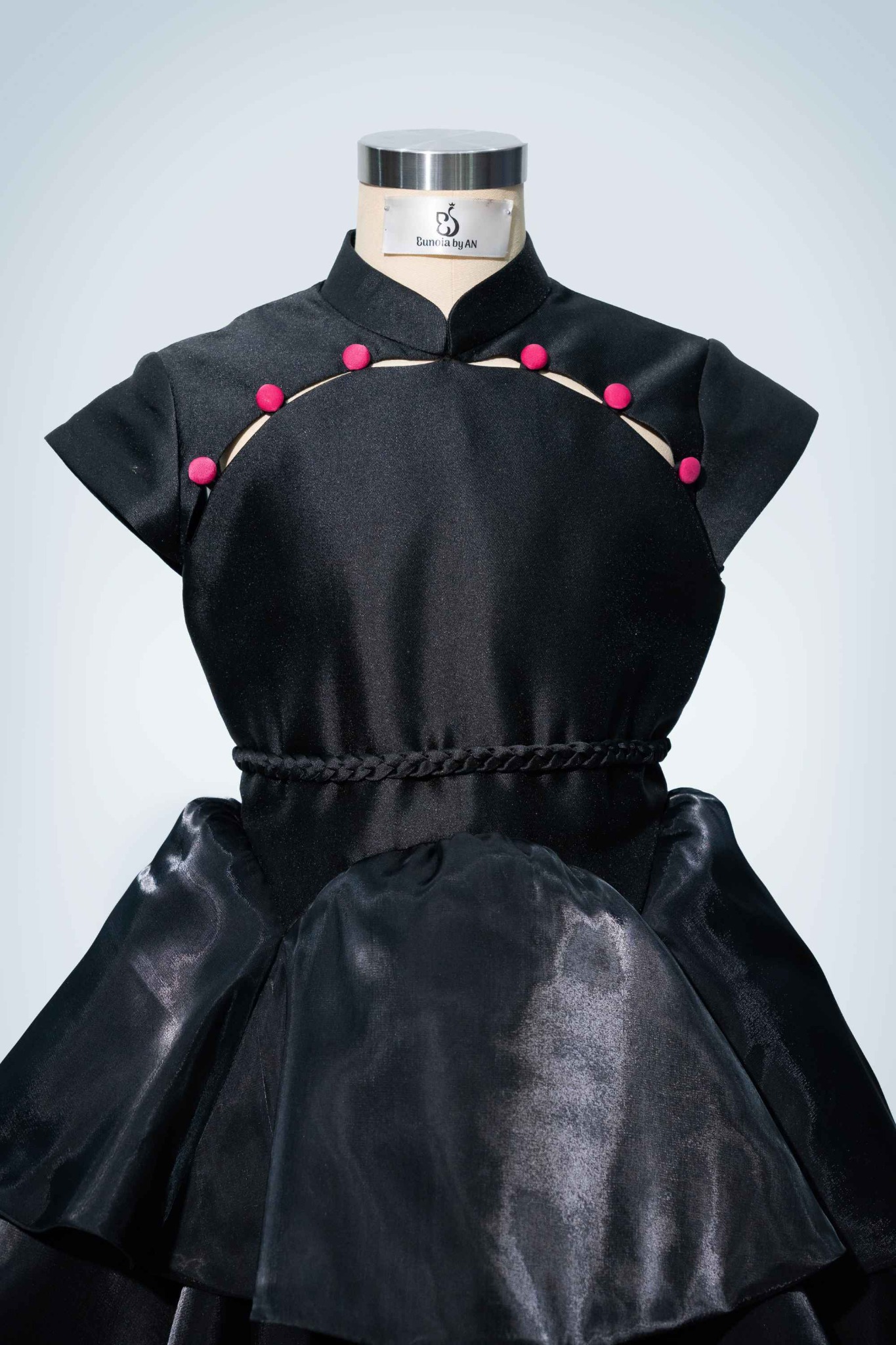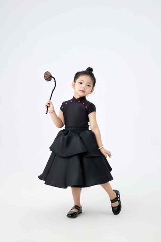 Không cầu kỳ với quá nhiều đường nét, Gia Ý là thiết kế với câu chuyện về sự tinh tế khi pha trộn giữa cảm hứng phương Đông ở thân trên được cách điệu từ chiếc áo sườn xám với tùng váy 2 tầng đẩy volume tối đa để mang đến vẻ đài các cho con gái nhỏ.
