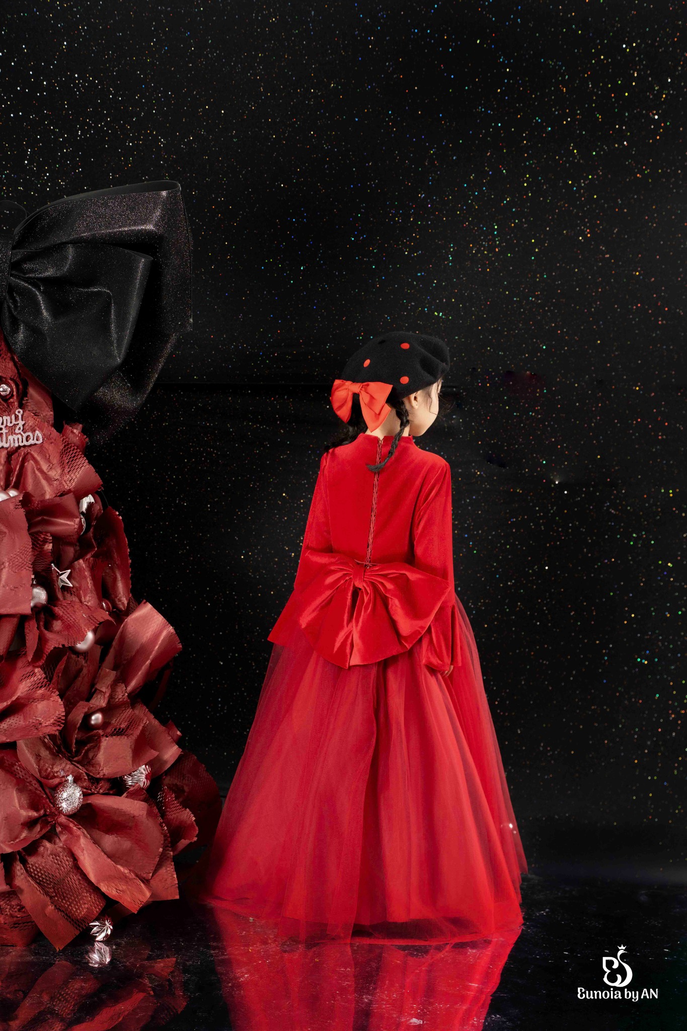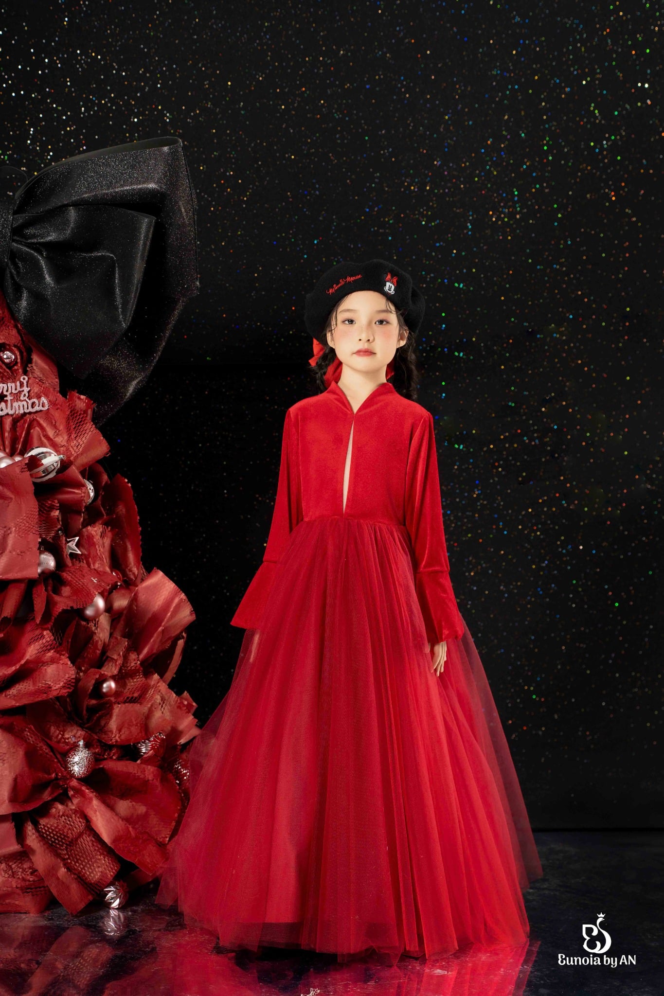 Hồng Thảo - mang ý nghĩa về sự tươi mới và những phúc khí đầu năm - được đội ngũ Eunoia thể hiện trọn vẹn qua ngôn ngữ thời trang với những điểm nhấn đầy tinh tế ở nơ bản to sau lưng, tay áo xòe mềm mại và những sóng váy công chúa dịu dàng.